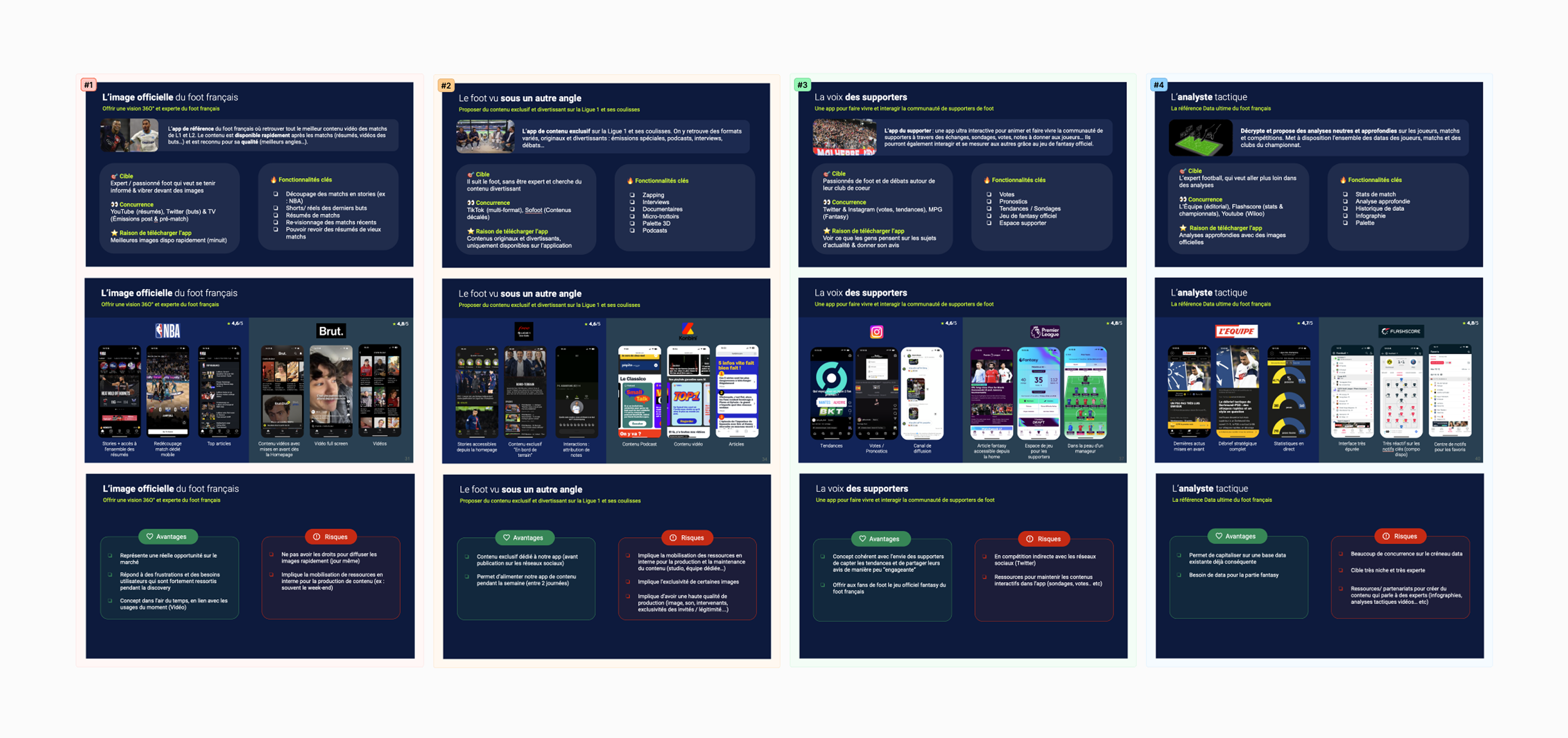 To explore how the app could support these visions, we also mapped a typical Ligue 1 week, identifying the types of content the LFP could deliver—videos, articles, games, and more.