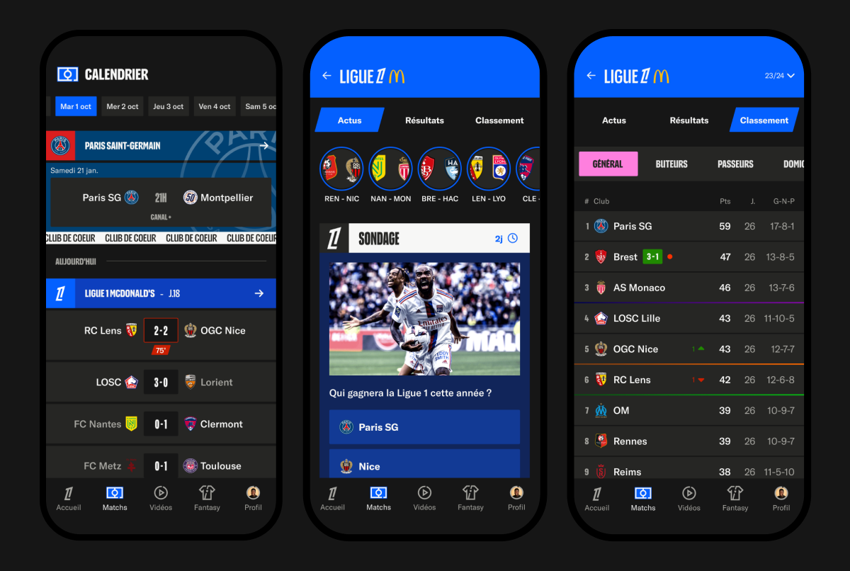 The Ligue 1 project involved the complete redesign of the official digital product, covering both the mobile app and the website.The objective was to deliver a modern, immersive experience tailored to football fans, while unifying content, live data, and video within a single ecosystem.The project required balancing strong brand expression, complex content structures, and performance constraints, all within a tight seasonal timeline aligned with the football calendar.